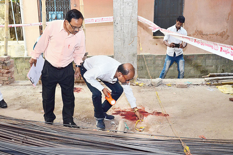 অকুস্থলে: নির্মীয়মাণ সেই বহুতলে ফরেন্সিক বিশেষজ্ঞেরা। শনিবার, দমদম পার্কে। ছবি: স্নেহাশিস ভট্টাচার্য