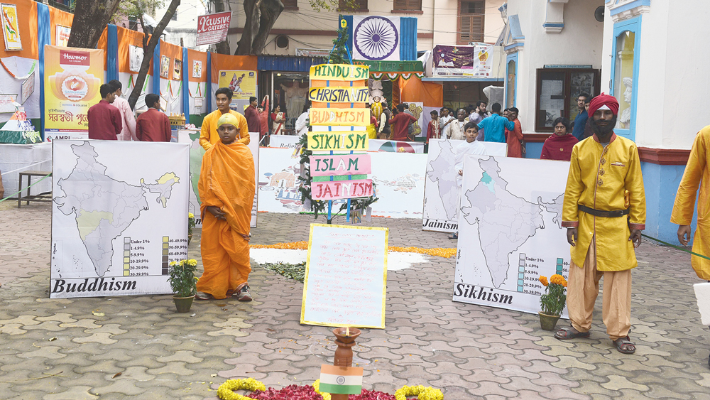 উত্তর কলকাতার স্কটিশ চার্চ কলেজিয়েট স্কুল চত্বরে ঢুকলে মনে হবে, সেখানে তৈরি করা হয়েছে একটি ছোটখাটো ভারত। থার্মোকল দিয়ে তৈরি মন্দির, মসজিদ, গির্জা আর ভারতের মানচিত্রের পাশেই বিভিন্ন ধর্মাবলম্বীদের মতো সেজে স্কুলপড়ুয়ারা ঘুরে বেড়াচ্ছে মণ্ডপে। সেখানে লেখা, ‘‘উত্তরে হিমালয় থেকে দক্ষিণে কন্যাকুমারী। এই বিস্তীর্ণ অঞ্চলের নাম ভারতবর্ষ। আমার, আমাদের পরিচয় ভারতবাসী।’’ একটি মডেলে আবার দেখা যাচ্ছে, বিভিন্ন ধরনের পোশাকে বহু মানুষ। তার উপরে লেখা, ‘পোশাকে যায় না মানুষ চেনা।’ মণ্ডপের এক জায়গায় রয়েছে দেশের বিভিন্ন এলাকার ভিন্ন ভিন্ন ধরনের খাবার। স্কুলের শিক্ষক শুভদীপ বন্দ্যোপাধ্যায় বললেন, ‘‘এ দেশে মানুষের পোশাক, খাবার এবং সংস্কৃতির মধ্যে বৈচিত্র রয়েছে— মণ্ডপসজ্জায় এ সবই দেখানো হয়েছে। কিন্তু এত বৈচিত্রের মধ্যেও আমাদের সবার পরিচয় আমরা ভারতবাসী।’’