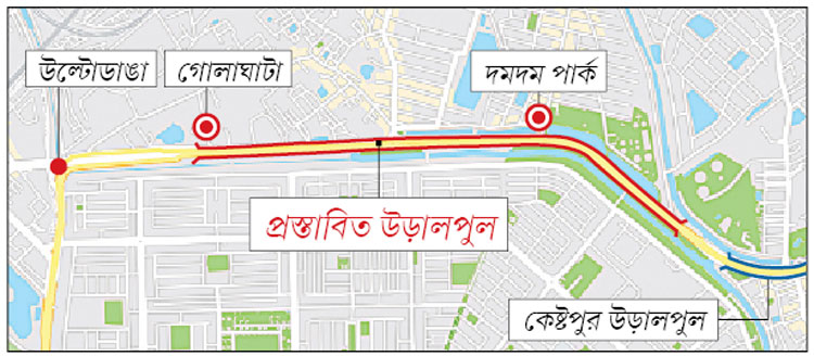 এখন দমদম পার্ক থেকে রঘুনাথপুর পর্যন্ত একটি উড়ালপুল রয়েছে। তাতে বিমানবন্দরগামী গাড়িগুলির প্রাথমিক ভাবে কিছুটা সুবিধা হলেও তা যথেষ্ট বলে মনে করছে না পূর্ত দফতর। দফতরের কর্তাদের একাংশের ব্যাখ্যা, উল্টোডাঙা থেকে লেক টাউন-বাঙুর হয়ে বিমানবন্দরের দিকে যেতে এখন যানজটের কারণে অনেক বেশি সময় লাগছে। ফলে বর্তমান উড়ালপুলটি পুরোপুরি কার্যকরী হচ্ছে না। তাঁদের ধারণা, গোলাঘাটা থেকে দমদম পার্ক পর্যন্ত যে উড়ালপুল তৈরির সিদ্ধান্ত হয়েছে, তাতে যানজট সমস্যার স্থায়ী সমাধান সম্ভব হবে। কারণ, পরিকল্পিত উল্টোডাঙা-দমদম পার্ক উড়ালপুলটি পৌঁছে যাবে দমদম পার্ক-রঘুনাথপুরের বর্তমান উড়ালপুলের সামনে। দু’টি উড়ালপুলের মধ্যে একটি সিগন্যাল-ক্রসিং থাকবে। বিমানবন্দরগামী গাড়ি উল্টোডাঙা থেকে উড়ালপুল ধরে প্রায় সরাসরি বিমানবন্দরের কাছে পৌঁছে যেতে পারবে। আবার নতুন উড়ালপুল থেকে নেমে ক্রসিং ব্যবহার করে যাওয়া যাবে কেষ্টপুর বা বাগুইআটির দিকে।