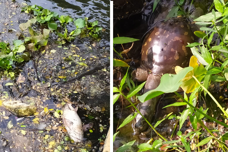 দূষণের জেরে মাছ, কচ্ছপ ভেসে উঠছে। নিজস্ব চিত্র।