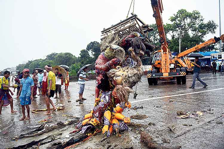 ঘাটের কাছে ছাউনি বাঁধাই ছিল। ভোর থেকে রাখা ছিল গঙ্গা থেকে কাঠামো তুলে নিয়ে যাওয়ার ক্রেন এবং পুরসভার গাড়ি। বিপর্যয় মোকাবিলা বাহিনীর সঙ্গে তৈরি ছিল পুলিশও। কিন্তু দশমীর পরদিনের প্রতিমা নিরঞ্জনে তাল কাটল বৃষ্টি। যদিও একাদশীর সন্ধ্যার পরে বৃষ্টি থামলে ঘাটগুলিতে ভিড় বাড়তে থাকে উদ্যোক্তাদের। তবে পুলিশের দেওয়া তথ্য দেখলেই দু’দিনের প্রতিমা বিসর্জনের পার্থক্য বুঝতে পারা যায়। পুলিশ সূত্রের খবর, দশমীতে বিসর্জন হয়েছিল ১,৮৬৪টি প্রতিমা। একাদশীতে প্রতিমা নিরঞ্জনের সংখ্যা ছিল তুলনায় কম।