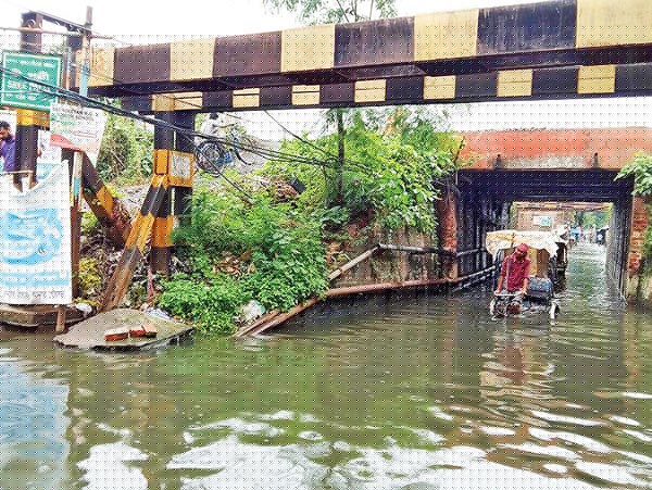 বৃষ্টি শুরু হলেই ‘জলবন্দি’ হওয়ার আশঙ্কায় থাকেন নোয়াপাড়া মেট্রো স্টেশন সংলগ্ন এলাকার বাসিন্দারা। এক দিন টানা বৃষ্টিতেই ডুবে যায় আন্ডারপাস। এ বারেও সেই ছবি বদলায়নি। ১৭, ১৮, ১৯ নম্বর ওয়ার্ডের সংযোগস্থলে অক্ষয়কুমার মুখার্জি রোডের আন্ডারপাসটির উপরে রয়েছে শিয়ালদহ ডিভিশনের রেল লাইন। পাশ দিয়ে গিয়েছে বাগজোলা খাল। বাসিন্দাদের অভিযোগ, বৃষ্টিতে খাল ভর্তি হলেই আন্ডারপাসও ডুবে যায়। খালের জল না নামা পর্যন্ত ডুবে থাকে। বাসিন্দা ও মেট্রো যাত্রীদের বি টি রোডের দিক থেকে মেট্রো স্টেশনের দিকে যেতে হলে ঝুঁকি নিয়ে রেল লাইন পেরোতে হয়। ১৭ নম্বর ওয়ার্ডের কাউন্সিলর অঞ্জন পাল বলেন, ‘‘রেলকে বারবার বলা হয়েছে বেলঘরিয়া ও দমদমের দিকে লাইন উঁচু করতে হবে। তা হলেই আন্ডারপাসটিও উঁচু করা যাবে। কিন্তু পাঁচ বছর আগে রেলকর্তারা পরিদর্শন করলেও আর কিছু হয়নি।’’