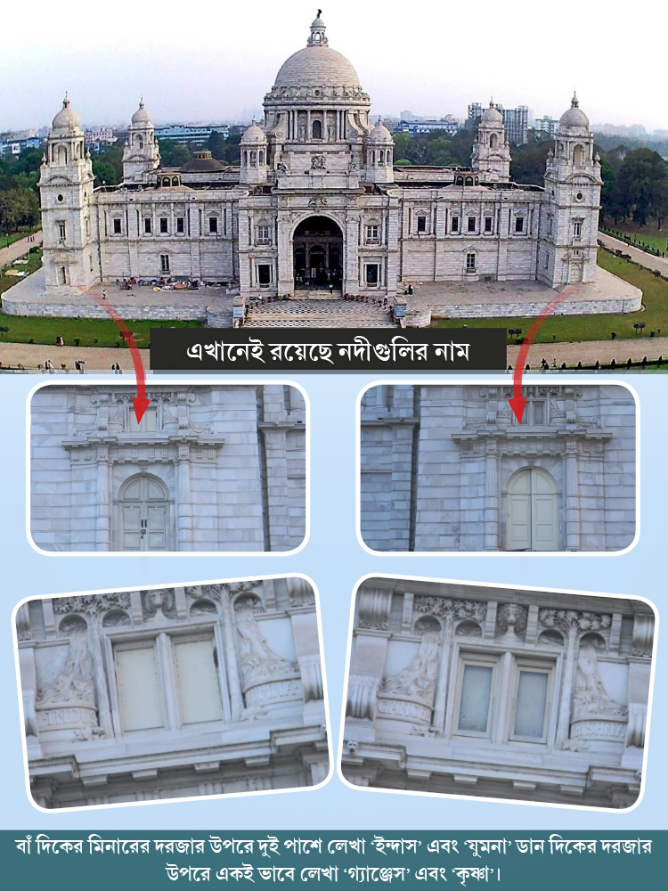 সিন্ধু সভ্যতা থেকে মুঘল সাম্রাজ্য— সিন্ধু নদ এবং গঙ্গা-যমুনা অববাহিকাতেই লালিত পালিত হয়েছে ভারতীয় উপমহাদেশ। ব্রিটিশ ইস্ট ইন্ডিয়া কোম্পানির কাছ থেকে ক্ষমতার রাশ হাতে নিয়ে, পশ্চিমে সিন্ধু নদ ও তার অববাহিকা, উত্তরে ও পূর্বে গঙ্গা-যমুনা দোয়াব এবং দক্ষিণে কৃষ্ণা নদী পেরিয়ে বিস্তৃত অখণ্ড ভারতের শাসক হয়ে উঠেছিলেন মহারানি ভিক্টোরিয়া। সেই সাম্রাজ্যের বিস্তৃতি বোঝাতেই সম্রাজ্ঞীর স্মৃতিতে তৈরি সৌধের গায়ে ওই চারটে নদীর নাম লেখা।