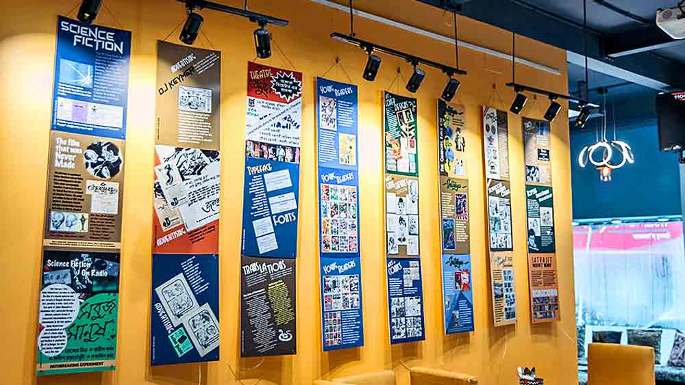 অতিমারির বিধিনিষেধের শহরে কফি শপ-রেস্তরাঁ খোলা থাকছে অনেকটা সময়, ভিড় কি হচ্ছে তেমন? তবে সত্যজিৎ রায়কে রেস্তরাঁয় দেখতে পেলে অন্য কথা। গোলপার্কের ‘ট্রাইব’ রেস্তরাঁয় চলছে প্রদর্শনী ‘অচেনা রে’, সত্যজিৎ রায়ের জন্মশতবর্ষে অভিনব উদ্যোগ। একটা দেওয়াল জুড়ে সাজানো এক্ষণ পত্রিকার প্রচ্ছদ-প্রতিলিপি, সত্যজিতের ছবির চিরচেনা পোস্টারে ঝলমল আর একটা দেওয়াল। জটায়ুর লেখা রহস্য-রোমাঞ্চ সিরিজ়ের বইগুলোর প্রচ্ছদ কেমন হতে পারত, তাও দেখার সুযোগ থাকছে— জটায়ু নামের বিশেষ উপহার-বাক্সে কুড়িরও বেশি রঙিন কার্ড, সুদৃশ্য নোটবুকও মিলছে কেনার জন্য। রেস্তরাঁ জুড়ে অন্দরশোভায় সত্যজিতের লেখা বইয়ের প্রচ্ছদপট, অলঙ্করণ, ক্যারিকেচার, ক্যালিগ্রাফির পরিচয় (ছবিতে)— মেনু কার্ড, খাবারেও সত্যজিৎ-কীর্তির বিচিত্র স্বাক্ষর। পুরো জুলাই-অগস্ট জুড়েই চলবে প্রদর্শনী।