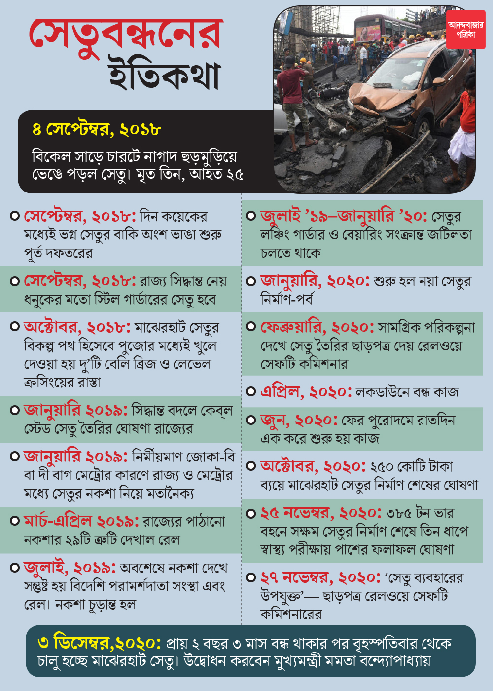 দীর্ঘ অপেক্ষার অবসান হতে চলেছে। প্রায় ২ বছর ৩ মাস বন্ধ থাকার পর বৃহস্পতিবার থেকে চালু হচ্ছে মাঝেরহাট সেতু। পশ্চিমবঙ্গের মুখ্যমন্ত্রী মমতা বন্দ্যোপাধ্যায় বৃহস্পতিবার বিকালে সেতুর উদ্বোধন করবেন। ফলে আজ, অর্থাৎ ৩ ডিসেম্বর থেকেই যান চলাচলের জন্য খুলে যাচ্ছে দক্ষিণ কলকাতার গুরুত্বপূর্ণ সংযোগকারী সেতুটি। এই সেতু এবং তারাতলা-আলিপুর সংলগ্ন রাস্তায় যান চলাচলের জন্য নির্দেশিকা দিয়েছে কলকাতা পুলিশ।