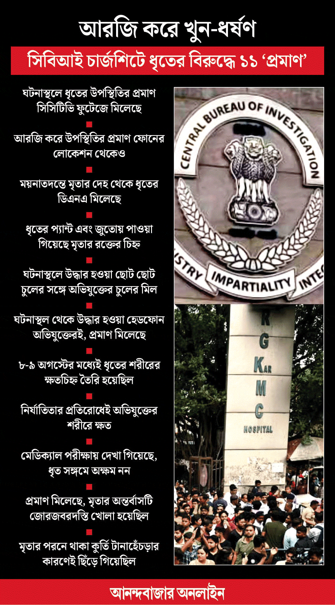 সিবিআই চার্জশিটে লেখা হয়েছে, ধৃত সিভিক ভলান্টিয়ারই যে আরজি করে মহিলা চিকিৎসককে ধর্ষণ এবং খুনের ঘটনায় জড়িত, তার বহু প্রমাণ হাতে রয়েছে। সংগৃহীত বয়ান, ভিডিয়ো এবং ফরেন্সিক বা সায়েন্টিফিক রিপোর্টের ভিত্তিতে ধৃতের বিরুদ্ধে মোট ১১টি প্রমাণ পাওয়া গিয়েছে। সিবিআই চার্জশিটে যে ১১টি প্রমাণ দিয়েছে, তা হল—