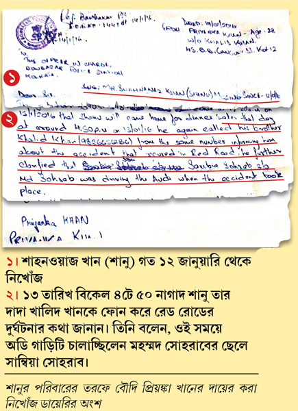 প্রথম দিনেই উঠে এসেছে তাঁর নাম। শোনা গিয়েছে, তৃণমূল নেতা মহম্মদ সোহরাবের দুই ছেলে আম্বিয়া ও সাম্বিয়ার ঘনিষ্ঠ তিনি। এ-ও শোনা গিয়েছে, গত বুধবার ভোরে রেড রোডে কুচকাওয়াজের মহড়ায় ঢুকে পড়া ঘাতক অডি গাড়িতে তিনি ছিলেন বলেই সন্দেহ করছে পুলিশ। ২৪ বছরের সেই যুবক শাহনওয়াজ খান ওরফে শানুর নামেই এ বার নিখোঁজ ডায়েরি করল তাঁর পরিবার। পুলিশের কাছে শানুর বৌদির দাবি, দুর্ঘটনার সময়ে অডি গাড়িটি সাম্বিয়া চালাচ্ছিলেন বলে শানুই তাঁদের ফোনে জানিয়েছিলেন। কিন্তু বুধবার সন্ধ্যার ওই ফোনের পর আর যোগাযোগ করা যায়নি শানুর সঙ্গে।