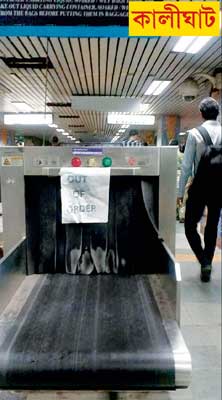 • পার্ক স্ট্রিট: ময়লা প্লাস্টিকে ঢাকা স্ক্যানারটি। ব্যস্ততম এই স্টেশনে মেটাল ডিটেক্টর গেট থাকলেও তার মধ্যে দিয়ে হেঁটে যাওয়ার কড়াকড়ি নেই। ডোরফ্রেম পেরিয়ে বা পাশ দিয়ে— যেখান দিয়ে খুশি যাতায়াত করছেন যাত্রীরা।