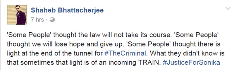 এ দিন ফেসবুকে সাহেব লেখেন, ‘কিছু মানুষ ভেবেছিলেন, আইন নিজের কাজ করবে না। কিছু মানুষ ভেবেছিলেন আমরা আশা হারিয়ে থেমে যাব। কিছু মানুষ ভেবেছিলেন সুড়ঙ্গের শেষে অপরাধীর জন্য আলো রয়েছে। কিন্তু তাঁরা জানেন না, কোনও কোনও সময় ওই আলোটা থাকে পরবর্তী ট্রেনের জন্য।’