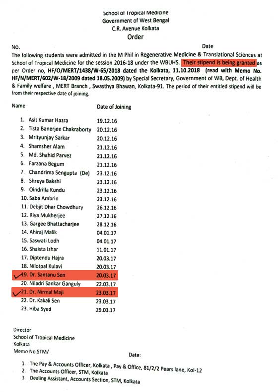 এই বিভাগেই ২০১৬-’১৮ শিক্ষাবর্ষে এমফিল করতে ভর্তি হন ২৩ জন। সেই তালিকায় ছিলেন চিকিৎসক-বিধায়ক নির্মল মাজি এবং চিকিৎসক-কাউন্সিলর শান্তনু সেন। নির্মলবাবু যোগ দেন ২০১৭ সালের ২৩ মার্চ। শান্তনুবাবুর যোগদানের তারিখ ২০১৭ সালেরই ২০ মার্চ। ২০১৮ সালের ১১ অক্টোবর একটি সরকারি নির্দেশিকা জারি করে (অর্ডার নম্বর-HF/O/MERT/1438/W-65/2018) এই দু’জন-সহ মোট ২৩ জনের নামে জলপানি অনুমোদিত হয়। জলপানির পরিমাণ, প্রতি মাসে ৩৮,৪০০ টাকা।