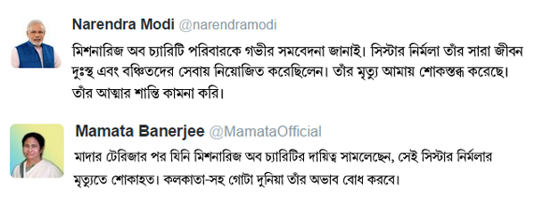 সিস্টারের মৃত্যুতে এ দিন টুইটারে শোকবার্তা জানিয়েছেন প্রধানমন্ত্রী নরেন্দ্র মোদী। মুখ্যমন্ত্রী মমতা বন্দ্যোপাধ্যায়ও টুইটারে শোকজ্ঞাপন করেছেন। তিনি জানিয়েছেন, কলকাতা-সহ গোটা দুনিয়া সিস্টার নির্মলার অভাব বোধ করবে।