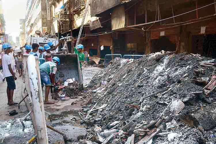 পোড়া বর্জ্য সরানোর কাজ চলছে পুরোদমে। রবিবার বিকেলে, বড়বাজারে। ছবি: স্বাতী চক্রবর্তী