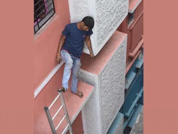 কখনও ছাদ থেকে, তো কখনও বা নীচে থেকে মই লাগিয়ে— প্রায় ৬ ঘণ্টা ধরে দমকলের কালঘাম ছুটে গেল তাকে উদ্ধার করতে। তবু, কার্নিস থেকে তাকে নামানো যায়নি। বরং, কার্নিস থেকে কার্নিসে লাফিয়ে বেড়াল সে। সকাল ১১টায় উঠেছিল। অবশেষে বিকেল পৌনে পাঁচটা নাগাদ নিজেই মই বেয়ে নীচে নেমে আসে ওই কিশোর।