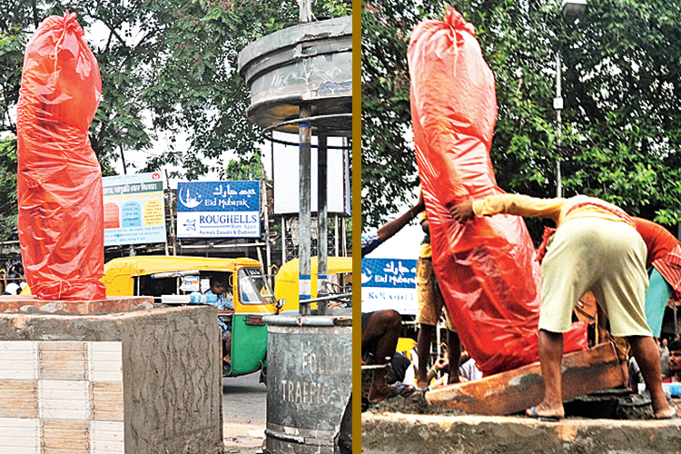 গত বছর মুচিবাজারে ট্র্যাফিক স্ট্যান্ডের কাছে এই মূর্তি বসানোর কাজ বন্ধ হয়ে গিয়েছিল। —ফাইল চিত্র।