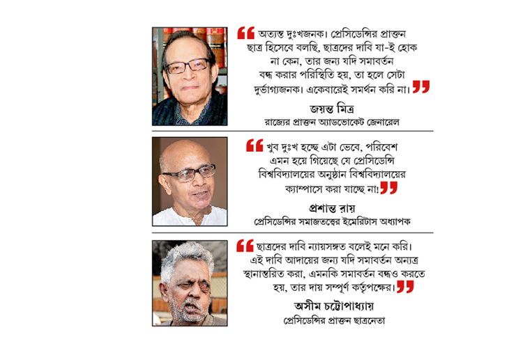 প্রেসিডেন্সি-কর্তৃপক্ষ জানান, সাত শতাধিক পড়ুয়ার ডিগ্রি পাওয়ার কথা ছিল। নন্দনে সমাবর্তন হলেও সেগুলো দেওয়া যাচ্ছে না। শুধু সাম্মানিক ডিএসসি এবং ডিলিট ডিগ্রি দেওয়া হবে। আন্দোলনকারীরা প্রেসিডেন্সির মূল ফটকে তালা ঝুলিয়ে যে-ভাবে সমাবর্তন সরিয়ে নিতে বাধ্য করিয়েছেন, কর্তৃপক্ষ তার সম্পূর্ণ দায় চাপাচ্ছেন ওই পড়ুয়াদের উপরেই। উপাচার্য অনুরাধা লোহিয়া বলেন, ‘‘এ-সব বরদাস্ত করা যায় না। যা ইচ্ছে তা-ই করবে? বিশ্ববিদ্যালয় অবরুদ্ধ করে দেবে? এটা চলতে পারে না। তাই ক্যাম্পাসে সমাবর্তন করা হবে না।’’ এ রাজ্যে ছাত্র আন্দোলনের ধাক্কায় কোনও বিশ্ববিদ্যালয়ের সমাবর্তন শেষ মুহূর্তে অন্যত্র সরিয়ে নিয়ে যেতে হয়েছে কি না, তা মনে করতে পারছে না শিক্ষা শিবির।