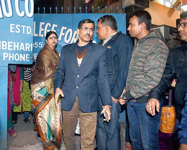 পুলিশ প্রহরায় বার করে আনা হচ্ছে অধ্যক্ষা অনিতা চট্টোপাধ্যায় গুপ্তকে। বৃহস্পতিবার, দেশবন্ধু কলেজে।