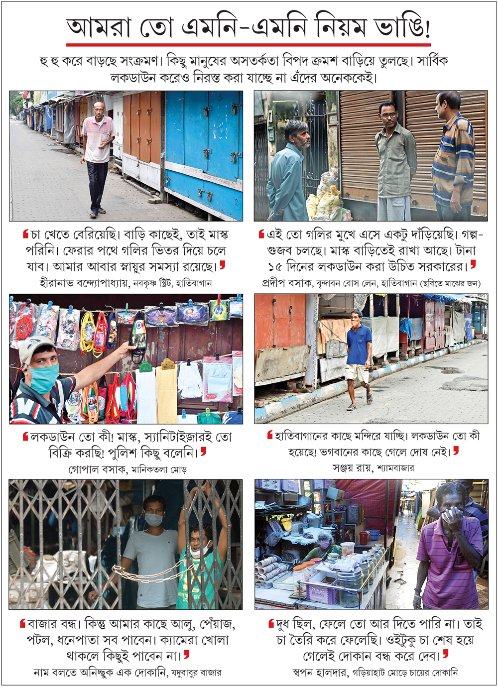 গড়িয়াহাট বাজারের এক দোকানির বক্তব্য, “লকডাউন মানুষের গা-সওয়া হয়ে গিয়েছে। একটু দাঁড়ালেই দেখতে পাবেন, কত লোক আসছেন।” দোকান খোলা কেন, জানতে চাওয়ায় যদুবাবুর বাজারের এক দোকানি আবার বললেন, “করোনা সকলের মধ্যেই আছে। ভেবে লাভ নেই।” মানিকতলা বাজারে আবার মাস্ক ছাড়াই তাস খেলায় ব্যস্ত এক ব্যক্তি। তাঁর যুক্তি, “মাস্ক তো শুধু দূরে যেতে হলে পরতে হয়!”