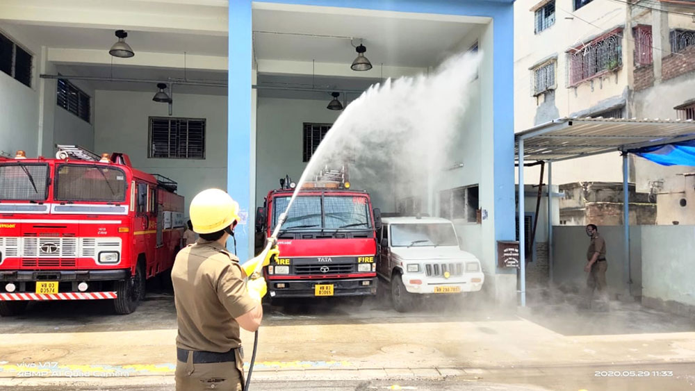 সুজিত বসু করোনায় আক্রান্ত হয়েছেন, সেই খবর পাওয়ার পরে শুক্রবার জীবাণুমুক্ত করা হচ্ছে দমকল কেন্দ্র চত্বর। নিজস্ব চিত্র