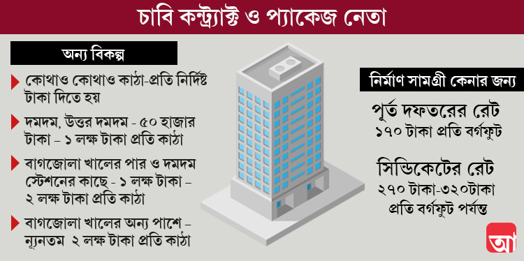 আবার, যেখানে এ ধরনের চুক্তি হয় না, সেখানে নির্মাণপর্বের প্রতি ধাপে সিন্ডিকেটের প্রাপ্য নির্দিষ্ট করা আছে বলে দাবি নির্মাতাদের। দেবেন্দ্রনগর এলাকার এক প্রোমোটার বলেন, ‘‘জমি কেনার পর কাউন্সিলরের অফিসে হাজিরা দিতে হয়। ওই অফিসেই ঠিক হয়, কোন প্রকল্পে কারা ইমারতি দ্রব্য সরবরাহ করবে। বর্গফুট-পিছু টাকার অঙ্কও সেখানে ঠিক হয়। আমি নিজেও তা করেছি। কিন্তু প্রমাণ তো থাকে না।’’ নাগেরবাজার অঞ্চলের এক প্রোমোটারের কথায়, ‘‘পূর্ত দফতরের তালিকা অনুযায়ী, বর্গফুট-পিছু দর হওয়ার কথা ১৭০ টাকা। অথচ সিন্ডিকেটের ভয়ে গড়ে ২৭০-২৮০ টাকা দরে নির্মাণ-সামগ্রী কিনতে বাধ্য হচ্ছি। কোথাও কোথাও ৩০০-৩২০ টাকা পর্যন্ত চাওয়া হচ্ছে। রাজি না-হলেই কাজ বন্ধ করে দেওয়ার হুমকি!’’