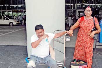 ট্যাক্সি নেই। কেঁদেই ফেললেন অসুস্থ রামনারায়ণ মহারাজ। সোমবার কলকাতা বিমানবন্দরে। ছবি: শৌভিক দে