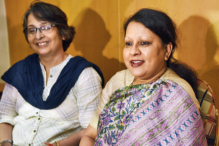 গর্বিত সাউথ পয়েন্ট স্কুলের প্রিন্সিপাল রূপা সান্যাল ভট্টাচার্য (বাঁ দিকে) ও শিক্ষিকা শর্মিলা দে সরকার। ছবি: সুমন বল্লভ