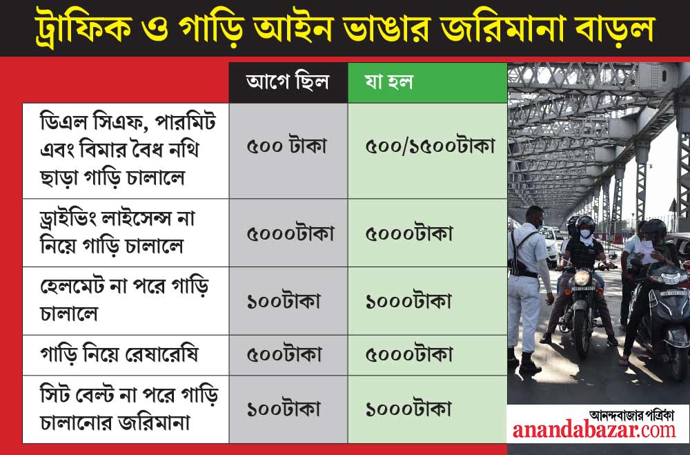 ডিএল সিএফ, পারমিট এবং বিমা বৈধ নথি ছাড়া গাড়ি নিয়ে রাস্তায় নামলে আগে জরিমানা ছিল ৫০০ টাকা। বর্তমান নির্দেশিকায় একই রাখা হয়েছে। বাড়ানো হয়েছে দ্বিতীয়বার আইন ভাঙার জরিমানা। আগে যা ছিল পাঁচশ টাকা এখনও তাকে বাড়িয়ে করা হয়েছে দেড় হাজার টাকা।