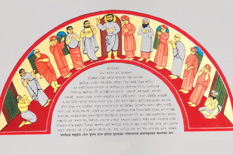 অবনীন্দ্রনাথ ঠাকুর ভারতশিল্পের অন্তরে প্রত্যক্ষ করেছিলেন রূপ এবং রূপাতীতের মিলনমাধুরী। বাংলার লোকশিল্পের অন্দরে তার অস্তিত্ব বহতা আজও। পল্লিবাংলার মানুষের সরল জীবনের ছন্দে, সহজ রেখায়-রঙে সৃজনের যে আনন্দ-উৎসব, তার প্রতি শ্রদ্ধা জানিয়ে ‘উদ্বোধন কার্যালয়’ মহালয়ায় প্রকাশ করতে চলেছে তাহেরপুরের লক্ষ্মীসরা কেন্দ্রিক নোটবুক, বিষ্ণুপুরের দশাবতার তাস সমন্বিত বুকমার্ক সেট এবং ‘বাংলার লোকশিল্পে শ্রীরামকৃষ্ণ’ বিষয় অবলম্বনে চিত্রিত রঙিন ক্যালেন্ডার। পূর্ববঙ্গে কোজাগরী লক্ষ্মীপূজার সঙ্গে সম্পৃক্ত তাহেরপুরের লক্ষ্মীসরা বাংলার অন্যতম লোকজ সম্পদ। অন্য দিকে বিষ্ণুপুরের মল্লরাজাদের পোষণায় ওড়িয়া ও মোগল তাসের সম্মিলনে জন্ম দশাবতার তাসের, এখন শৌখিন শিল্পকর্মমাত্র। ক্যালেন্ডারে মিশেছে নয়া পিংলা ও কালীঘাট পটচিত্রে, কৃষ্ণনগরের মাটির পুতুলে, বাংলার চালচিত্রে রামকৃষ্ণময় নবনির্মাণ (ছবি): লোকশিল্পী ও এই প্রজন্মের চারুশিল্পীদের শ্রমে, যত্নে।