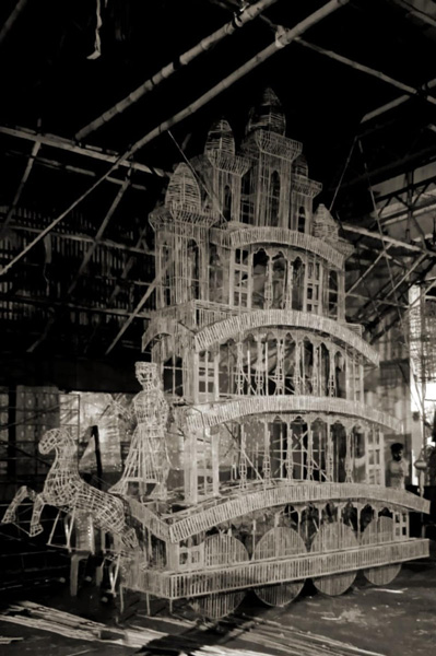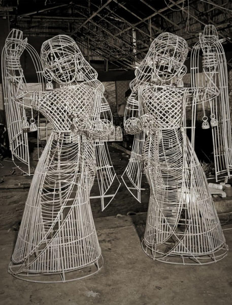 বাঁশ চট মাটির প্রলেপ দেওয়া কাঠামোর উপরে উজ্জ্বল রঙের ব্যবহারে, পূর্বজদের শিক্ষা মেনে চালচিত্র আঁকেন পটশিল্পী রামকৃষ্ণ সূত্রধর, পেশায় যিনি টোটোচালক! শিল্পীর আঁকা পটে নিহিত হাটসেরান্দি গ্রামের সূত্রধর সম্প্রদায়ের দুর্গাপট আঁকার প্রায় দু’শো বছরের ইতিহাস। লোহার স্তম্ভের গায়ে রামকৃষ্ণ রাজীব আদরগোপাল সূত্রধরদের আঁকা পটের ‘ট্রান্সলিট প্রিন্ট’কে (ছবিতে নীচে) ব্যবহার করা হয়েছে মণ্ডপসজ্জায়। আবার মধ্য কলকাতার রামবাগানের সুদীপ্ত মাইতি ও সহযোগী শিল্পীদের হাতে দ্বিমাত্রিক কাঠখোদাই ছবির রূপান্তর হচ্ছে ত্রিমাত্রিক শিল্পভাবনায়। পুরনো পঞ্জিকায় ছাপা রথ, গণপতি, নৃত্যরতা রমণী এ বার রূপ পেয়েছে বাঁশের কারুকাজে (ছবিতে), উনিশ শতকের কাঠখোদাইয়ের নির্যাস শিল্পীরা তুলে আনছেন এই মাধ্যমে। শিল্পরূপিণীর প্রকৃত অধিষ্ঠান যে সর্বজনের মাঝে, তা-ই মনে করিয়ে দেয় অনন্য এই শিল্পভাবনা।