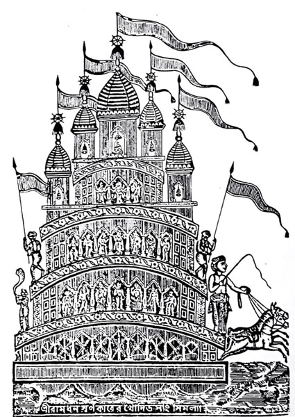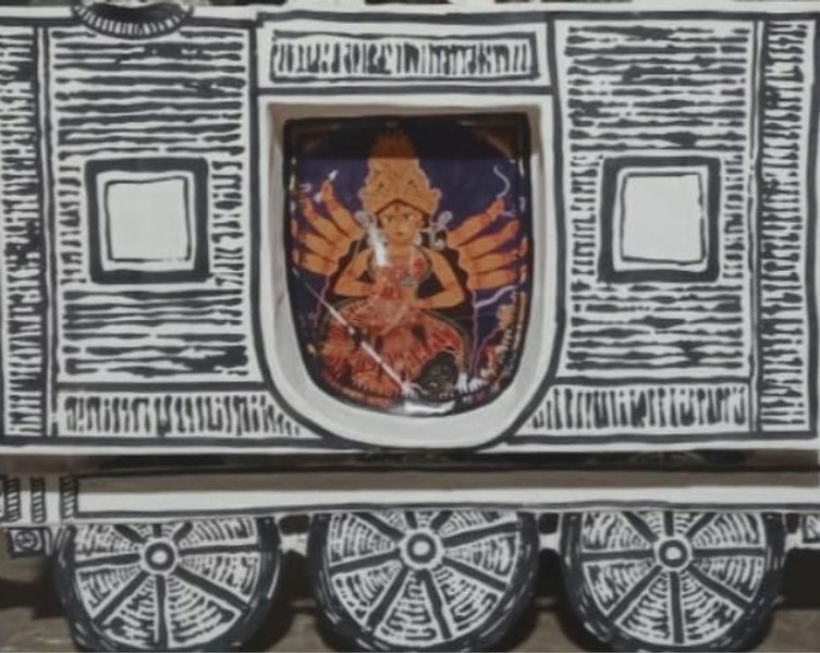 কথায় বলে ‘রথ টানলে দুর্গা আসে’। প্রবাদের যাথার্থ্য বোঝা যায় অনেক সাবেক পুজোর ক্ষেত্রে, রথযাত্রার দিন দুর্গাপ্রতিমা গড়ার কাজ শুরু হয় যে! আবার উনিশ শতকে কলকাতার সিমলেপাড়ার কাঠখোদাই শিল্পী রামধন কর্মকারের করা ছাপচিত্রের দিকে চোখ ফেরালে দেখা যায়, বাংলার টেরাকোটা মন্দিরের গঠন আকৃতি ও পঞ্চরত্ন চূড়ার সঙ্গে তার গঠনগত মিল। তবে কলকাতার বটতলা, গরানহাটা অঞ্চলকে কেন্দ্র করে গড়ে ওঠা কাঠখোদাই চিত্রের ইতিহাসের সঙ্গে আমাদের দুর্গাপুজোর আরও গভীর একটা সম্পর্ক আছে। একমাত্র ধনীগৃহে পূজিতা দুর্গাকে সর্বজনের ঘরে ঘরে পৌঁছে দেওয়ার কাজে কথকতা, পাঁচালি, পটের ছবির পাশাপাশি কাঠখোদাইয়ের ছাপচিত্রের বড় একটা ভূমিকা ছিল। এই পদ্ধতিতে ছাপা, সুলভ মূল্যের ছবির মাধ্যমেই দুর্গা-সহ অন্যান্য দেবদেবীর ছবি আবাহন-বিসর্জনের চক্র ছাড়িয়ে সাধারণ মানুষের ঘরে জায়গা পেল।