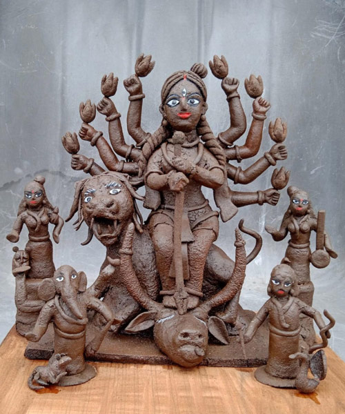 দুধ-চায়ের চল এখন অনেক বাড়িতেই কমছে ধীরে ধীরে। অথচ তাঁর দরকার ছিল ওই গুঁড়ো চা-পাতাই, চা তৈরি হয়ে যাওয়ার পর। বনহুগলির ৭৭/৫ রাইমোহন ব্যানার্জি রোডের হরিসাধন বিশ্বাস ফি-বছর একটি ছোট্ট ঠাকুর গড়েন, এক-এক বার এক-একটি উপকরণ দিয়ে। এ ভাবেই আগে আগে আটা, পেঁয়াজ ও রসুনের খোসা, ফুলের পাপড়ি, বীজ, তেজপাতা, গেঞ্জি-কাপড়, তার, পাইপের টুকরো তাঁর হাতে রূপ পেয়েছে অপরূপা দশভুজায়। পুজো আসার ঢের আগে থেকে তিনি ভাবতে আর খুঁজতে শুরু করেন, কী দিয়ে ‘ঠাকুর গড়া’ যায়। এ বছর প্রায় মাসখানেক আগে থেকে শুরু হয়েছিল পরীক্ষানিরীক্ষা: ব্যবহৃত গুঁড়ো চা-পাতা ভাল করে ধুয়ে, রোদে শুকিয়ে, ফের মিহি করে নিয়ে তার পর আঠা মেশানো, তারও পরে নানা চ্যালেঞ্জ পেরিয়ে সার্থকতায় পৌঁছনো। সাড়ে সাত ইঞ্চির দুর্গাপ্রতিমা, লক্ষ্মী সরস্বতী গণেশ কার্তিক মহিষ বাহনাদি-সহ। দেখে কে বুঝবে, গুঁড়ো চায়ের!