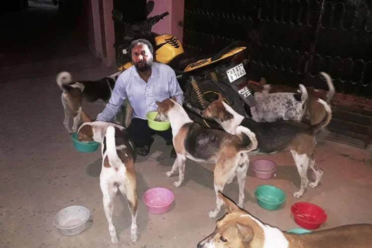 পথ কুকুর দের বাটিতে বাটিতে করে খেতে দিচ্ছেন চন্দ্রশেখর বাবু