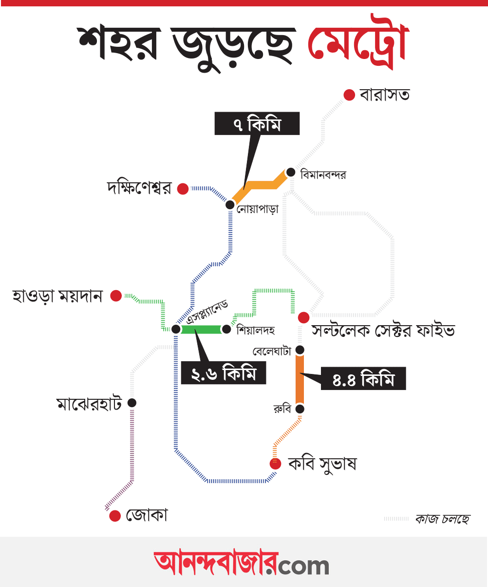 সল্টলেক সেক্টর ফাইভ থেকে হাওড়া ময়দান পর্যন্ত ইস্ট ওয়েস্ট মেট্রো প্রকল্প এত দিন দু’টি ভাগে চালু ছিল। প্রথমে চালু হয় সল্টলেক সেক্টর ফাইভ থেকে শিয়ালদহ স্টেশন (গ্রিন লাইন ওয়ান) পর্যন্ত অংশ। গত বছর থেকে হাওড়া ময়দান থেকে এসপ্ল্যানেড (গ্রিন লাইন টু) পর্যন্ত মেট্রো পরিষেবাও চালু হয়ে যায়। কিন্তু শিয়ালদহ থেকে এসপ্ল্যানেড পর্যন্ত মেট্রোর কাজে বার বার বিঘ্ন ঘটেছে অতীতে। বিশেষ করে বৌবাজার এলাকায় ধসের কারণে সমস্যায় পড়তে হচ্ছিল কলকাতা মেট্রোরেল কর্পোরেশন লিমিটেড (কেএমআরসিএল)-কে। এ বার সেই বাধা কাটিয়ে জুড়ে যাচ্ছে শিয়ালদহ-এসপ্ল্যানেডও। চালু হচ্ছে গোটা ইস্ট ওয়েস্ট মেট্রো। পাশাপাশি, প্রায় ৪.৪ কিলোমিটার দীর্ঘ রুবি-বেলেঘাটা রুটও উদ্বোধন হবে। বর্তমানে সংস্কারের কাজের জন্য কবি সুভাষ এবং শহিদ ক্ষুদিরাম মেট্রো স্টেশনের মধ্যে পরিষেবা (ব্লু লাইন) অনির্দিষ্ট কালের জন্য বন্ধ রয়েছে। এই পরিষেবা চালু হয়ে গেলে বেলেঘাটা থেকেও এক টিকিটে পৌঁছে যাওয়া যাবে হাওড়া, শিয়ালদহ স্টেশনে বা দমদম বিমানবন্দরে।