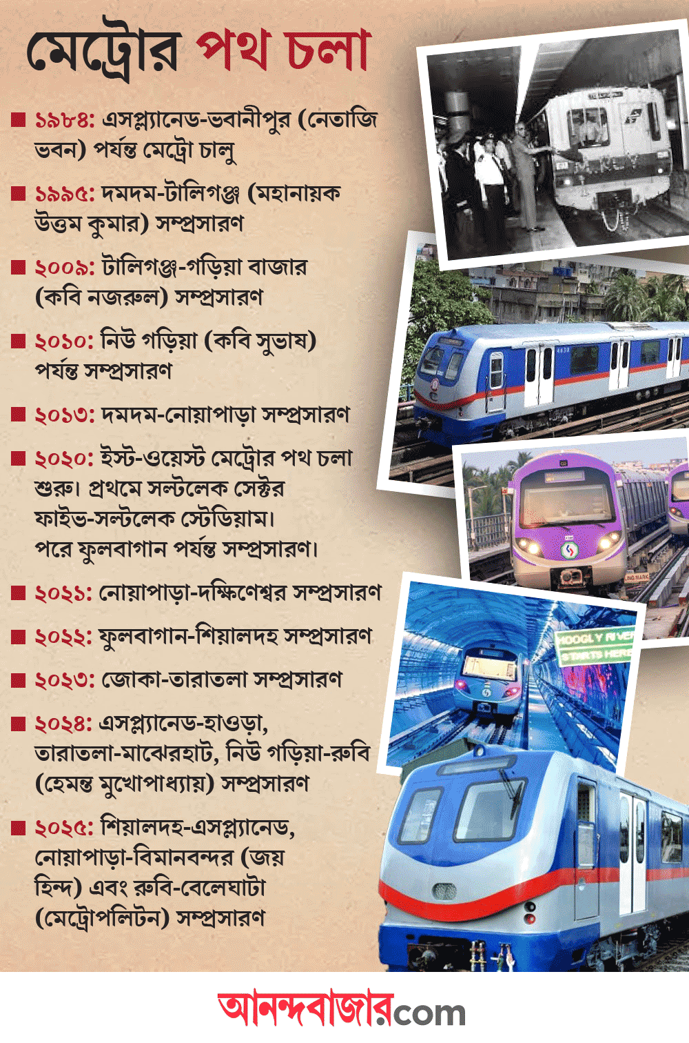 ১৯৮৪ সাল থেকে কলকাতা মেট্রোর পথ চলা শুরু। প্রথমে এসপ্ল্যানেড থেকে ভবানীপুরের মধ্যে পরিষেবা চালু হয়। তার পরে গত চার দশক ধরে পরিষেবা সম্প্রসারিত হয়েছে। অতীতে যখন প্রধানমন্ত্রী বা রেলমন্ত্রীর হাত ধরে কোনও মেট্রো পরিষেবার উদ্বোধন হয়েছে, তখন সঙ্গে সঙ্গে তা চালু হয়নি। ২০২০ সালে সল্টলেক সেক্টর ফাইভ থেকে সল্টলেক স্টেডিয়াম পর্যন্ত পরিষেবার উদ্বোধন হয় তৎকালীন রেলমন্ত্রী পীযূষ গয়ালের হাত ধরে। সাধারণের জন্য পরিষেবা চালু হয়েছিল তার পরের দিন থেকে। গত বছর প্রধানমন্ত্রী নরেন্দ্র মোদীর হাত ধরে গঙ্গার নীচ দিয়ে মেট্রো পরিষেবা চালু হয়। সাধারণের জন্য পরিষেবা চালু হয়েছিল তারও ৯ দিন পরে। আগামী শুক্রবার প্রধানমন্ত্রীর হাত ধরে শিয়ালদহ-এসপ্ল্যানেড-সহ মোট তিনটি সম্প্রসারণের উদ্বোধন হবে। মেট্রোর একটি সূত্রের দাবি, মোদীর হাত ধরে উদ্বোধনের পরেই সাধারণের জন্য চালু হয়ে যেতে পারে শিয়ালদহ-এসপ্ল্যানেড মেট্রো পরিষেবা। বাকি দু’টি লাইনে উদ্বোধনের ৪৮ ঘণ্টা পরে, অর্থাৎ সোমবার থেকে সাধারণের জন্য পরিষেবা চালু হতে পারে। যদিও মেট্রো রেল কর্তৃপক্ষ এ বিষয়ে সরকারি ভাবে কিছু জানাননি।
