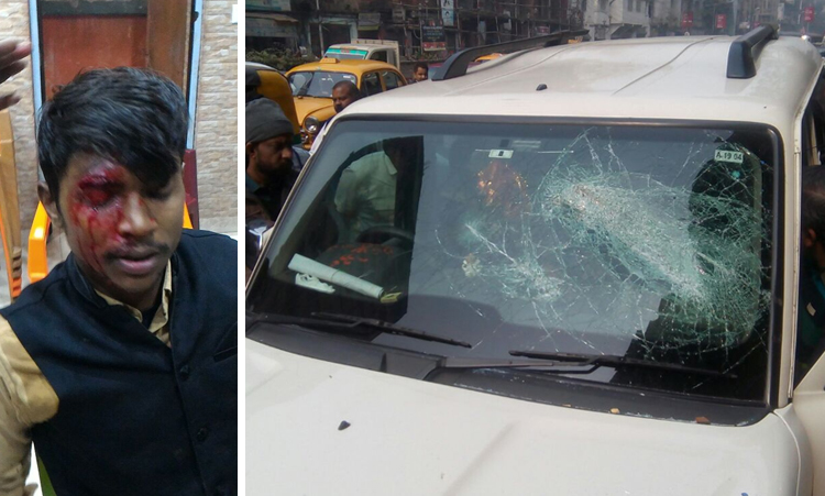 বিজেপি কর্মীকে মারধর (বাঁ দিকে)। আদালত নিযুক্ত পর্যবেক্ষকের গাড়িতে ভাঙচুর (ডান দিকে)। নিজস্ব চিত্র।