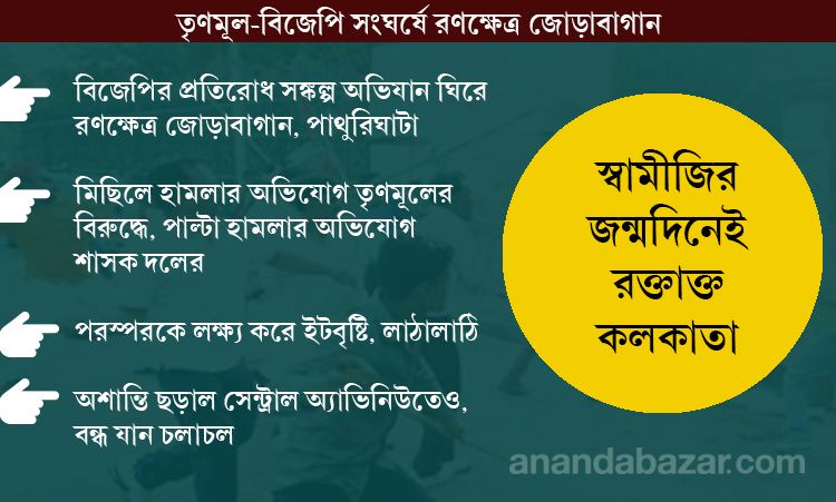 শহর জুড়ে আজ স্বামী বিবেকানন্দের জন্মোৎসব পালিত হচ্ছে। অনুষ্ঠান চলছে বিবেকানন্দের সিমলার বাড়িতে। আনন্দোৎসবের মাঝে স্বামীজির ভিটে থেকে কয়েকশো মিটারের মধ্যেই শুক্রবার রক্তাক্ত হল কলকাতা। তৃণমূল এবং বিজেপির সংঘর্ষে অগ্নিগর্ভ হয়ে উঠল জোড়াবাগান, পাথুরিঘাটা।