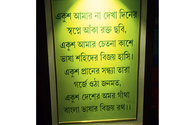মণ্ডপের ভিতরে ভাষা আন্দোলনের পোস্টারে একাধিক বানান ভুল (চিহ্নিত)। রবিবার, সার্পেন্টাইন লেনে।