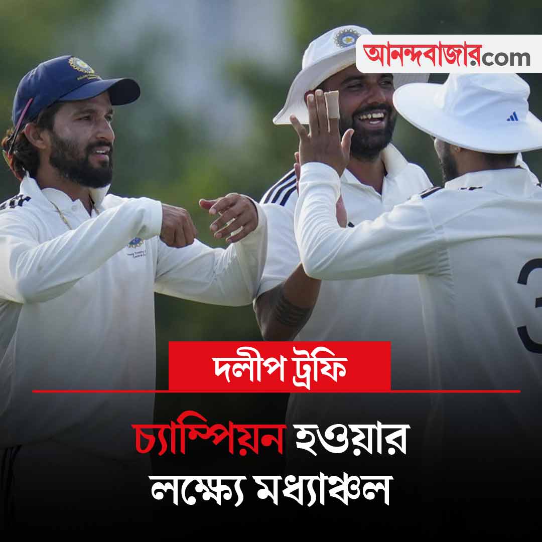 দলীপ ট্রফির ফাইনালে মুখোমুখি মধ্যাঞ্চল এবং দক্ষিণাঞ্চল। আজ শেষ দিনের খেলা। অঘটন না ঘটলে মধ্যাঞ্চলই চ্যাম্পিয়ন হবে। প্রথম ইনিংসে ৩৬২ রানের লিড নিয়েছে মধ্যাঞ্চল। দক্ষিণাঞ্চল দ্বিতীয় ইনিংসে লড়াই করলেও তা ম্যাচ জেতানোর জন্য যথেষ্ট নয়। খেলা শুরু সকাল ৯:৩০ থেকে।