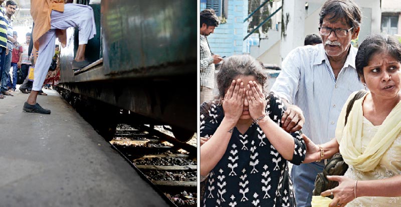 ট্রেন এবং প্ল্যাটফর্মের ব্যবধানই বাড়াচ্ছে বিপদ। (ডান দিকে) ভেঙে পড়েছেন বিপ্লববাবুর মেয়ে দেবদত্তা। বৃহস্পতিবার। ছবি: বিশ্বনাথ বণিক