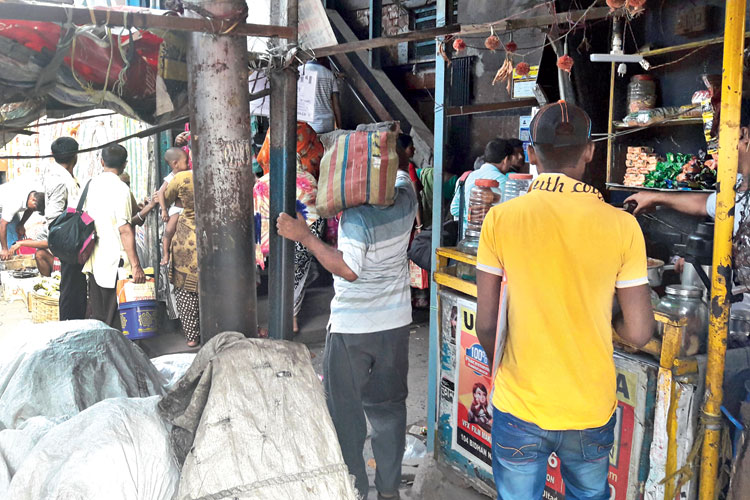 বেহাত: উল্টোডাঙায় স্টেশন সংলগ্ন রাস্তার ফুটপাত হকারদের দখলে। সোমবার। ছবি: স্নেহাশিস ভট্টাচার্য