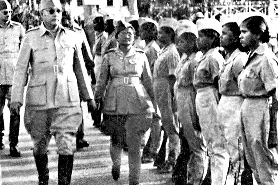 “সুভাষজি, সুভাষজি, উও জান-এ-হিন্দ আ গয়ে/ হ্যায় নাজ় জিসপে হিন্দ কো, উও শান-এ-হিন্দ আ গয়ে...” আজাদ হিন্দ ফৌজের অস্তিত্বের সঙ্গে জড়িয়ে থাকা এই শব্দগুলো স্রেফ এক গানের বাণী বললে ভুল হবে, ভারতের স্বাধীনতার ইতিহাসের এক পুরোধাপুরুষের জয়গান তা। স্বাধীনতার পঁচাত্তর বছর ও সুভাষচন্দ্র বসুর জন্মের একশো পঁচিশ বছর উদ্যাপন মাথায় রেখে কলকাতার নাট্যগোষ্ঠী ‘কার্টেন কল’ এ বার মঞ্চে আনছে নেতাজি ও আইএনএ-র প্রেক্ষাপটে নতুন নাট্যপ্রযোজনা— নিতান্ত ব্যক্তিগত। আইএনএ-র ‘ঝাঁসির রানি রেজিমেন্ট’-এর পাঁচ অকুতোভয় ‘রানি’র ব্যক্তিগত বয়ানে গড়ে উঠেছে নাটকের শরীর; লিখেছেন সৌনাভ বসু, সিনোগ্রাফি শাশ্বত চট্টোপাধ্যায়ের, নির্দেশনায় তীর্থঙ্কর চট্টোপাধ্যায়— দেখা যাবে আজ অ্যাকাডেমি মঞ্চে, আগামী কাল ২ জুলাই মধুসূদন মঞ্চে সন্ধ্যা ৬টায়। ১৯৪৩-এর ১২ জুলাই এই বাহিনী গড়ার ঘোষণা করেন নেতাজি, এগিয়ে আসছে সেই দিনটিও। ছবিতে ঝাঁসির রানি বাহিনী পরিদর্শনে নেতাজি।