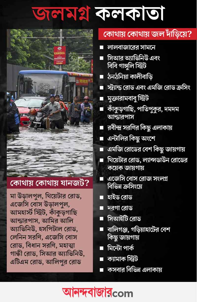 লালবাজারের সামনে এবং আশপাশে জল জমেছে। শুধু তা-ই নয়, সিআর অ্যাভিনিউ এবং বিবি গাঙ্গুলি স্ট্রিট, ঠনঠনিয়া কালীবাড়ি, স্ট্র্যান্ড রোড এবং এমজি রোড ক্রসিং, মুক্তারামবাবু স্ট্রিট, কাঁকুড়গাছি আন্ডারপাস, পাতিপুকুর আন্ডারপাস, দমদম আন্ডারপাস, রবীন্দ্র সরণির কিছু এলাকায়, এন্টালির কিছু অংশে, এমজি রোডের বেশ কিছু জায়গায়, থিয়েটার রোড, ল্যান্সডাউন রোডের কয়েক জায়গায়, এজেসি বোস রোড সংলগ্ন বিভিন্ন ক্রসিংয়ে, হাইড রোড, দরগা রোড, সিআইটি রোড, বালিগঞ্জ, গড়িয়াহাটের বেশ কিছু জায়গায়, মিন্টো পার্ক, ক্যামাক স্ট্রিট, কসবার বিভিন্ন এলাকা জলমগ্ন।
