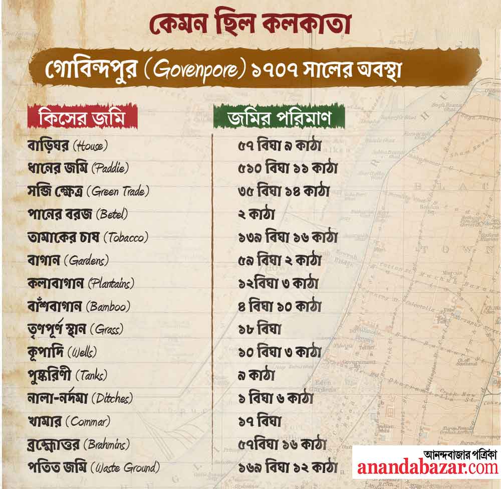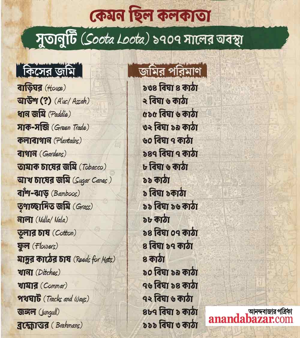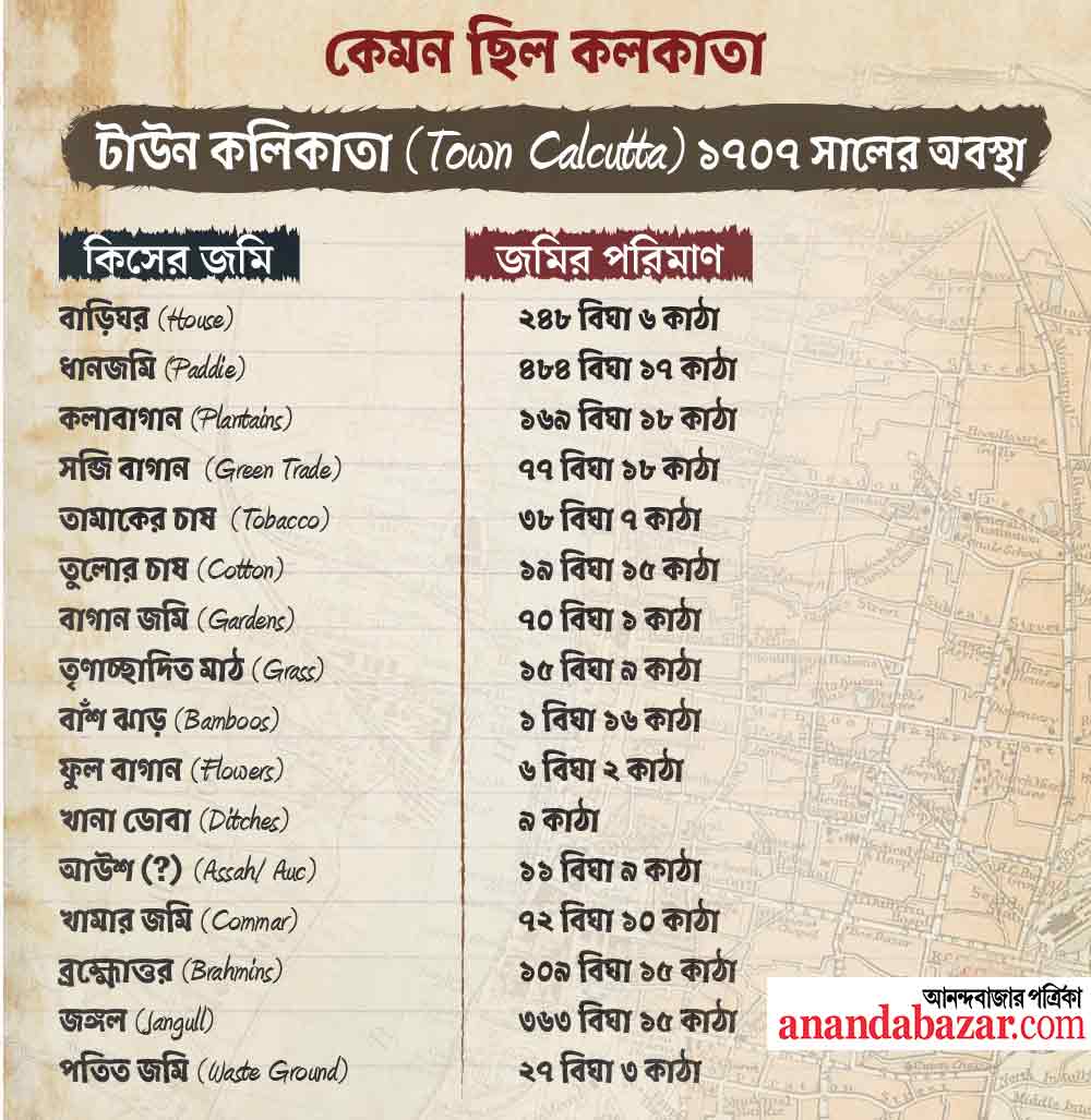 সুতানুটিতে দেখা যাচ্ছে— বাড়িঘরের জমির পরিমাণ যেখানে ১৩৪ বিঘার মতো, সেখানে ধানজমি ৫১৫ বিঘা আর জঙ্গল ছিল ৪৮৭ বিঘা। টাউন কলকাতার ছবিটাও একই রকম। বাড়িঘরের জমির পরিমাণ ছিল ২৪৮ বিঘার মতো। সেখানে জঙ্গল ৩৬৪ বিঘার কাছাকাছি। ধানজমি প্রায় ৪৮৫ বিঘার মতো।