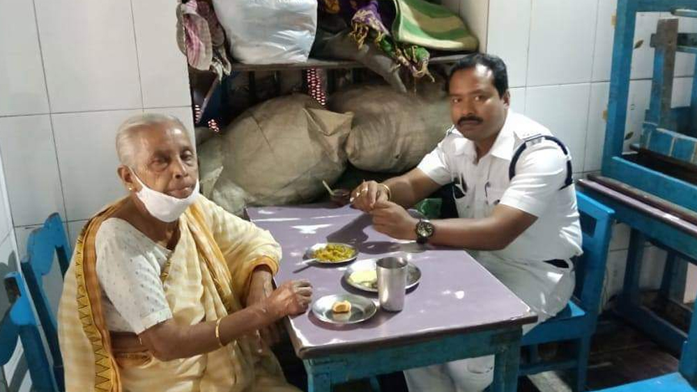 ভগবতী দে-কে খাওয়াচ্ছেন বৌবাজার থানার সার্জেন্ট সৌরভ দাস। নিজস্ব চিত্র।
