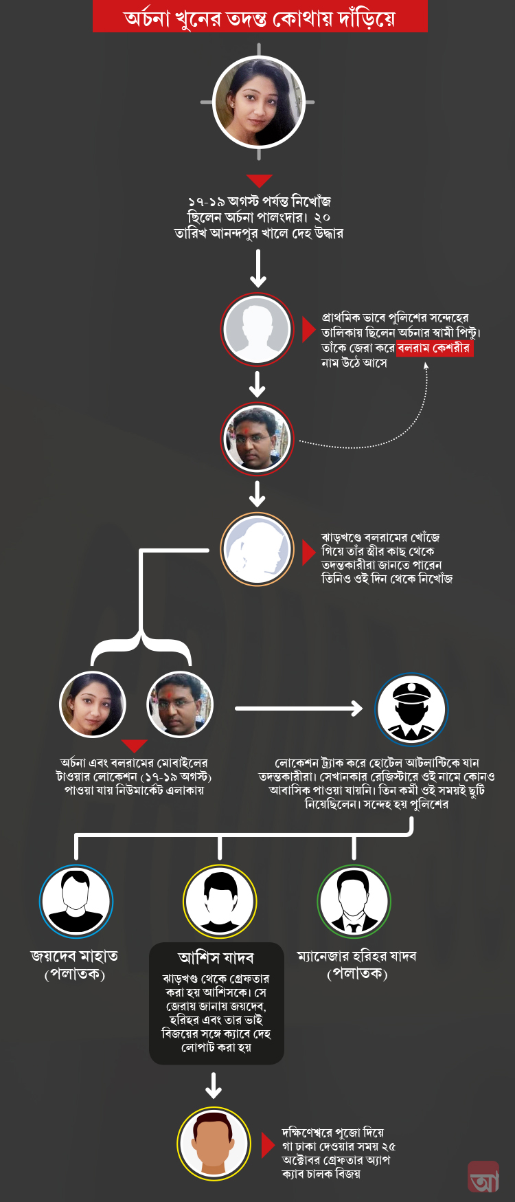 তদন্তে আগেই জানা গিয়েছিল, দেহ লোপাটের ঘটনায় হোটেলের কর্মীরা যুক্ত ছিল। ঝাড়খণ্ড থেকে গ্রেফতার করা হয় অস্থায়ী কর্মী আশিস যাদবকে। তাঁকে জেরা করে আরও দু’জন কর্মীর নাম জানা যায়। তাদের মধ্যে একজন হোটেলের ম্যানেজার হরিহর যাদব, অন্যজন জয়দেব মাহাত। ওই দু’জন এখনও অধরা।