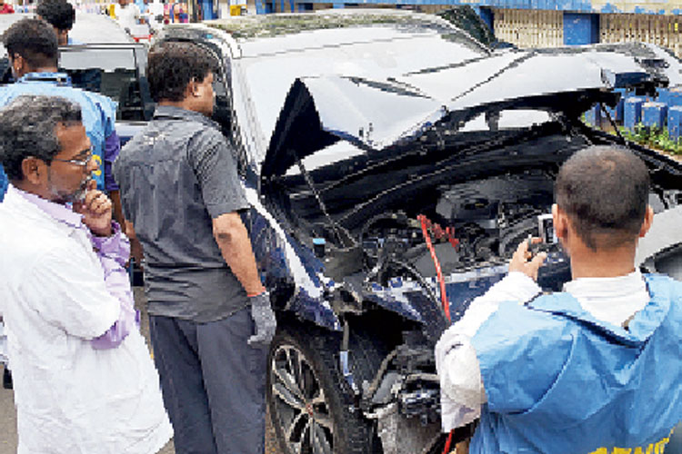মঙ্গলবার দুর্ঘটনাগ্রস্ত জাগুয়ার গাড়িটির পরীক্ষা করা হয় শেক্সপিয়র সরণি থানার সামনে। ছবি: রণজিৎ নন্দী।