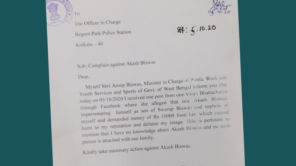 পুলিশ সূত্রে খবর, প্রতারণার কথা জানতে পেরে সোমবার রিজেন্ট পার্ক থানায় অভিযোগ দায়ের করেন মন্ত্রী অরূপ বিশ্বাস। ওই রাতেই অভিযুক্তকে গ্রেফতার করে পুলিশ। ধৃতের বিরুদ্ধে ভারতীয় দণ্ডবিধি ৪১৯, ৩৮৪, ৫০০ এবং ১২০বি ধারায় মামলা হয়েছে। এই ঘটনায় আর কারা জড়িত, তা খতিয়ে দেখছে পুলিশ।