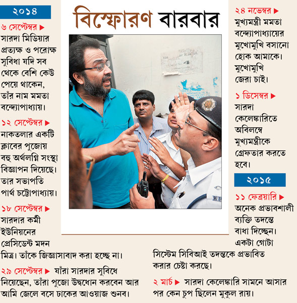 সারদা কেলেঙ্কারিতে শাসক দলের নেতাদের বিরুদ্ধে কুণালের অভিযোগ নতুন কিছু নয়। গত ২ ডিসেম্বর ব্যাঙ্কশাল আদালত থেকে বেরোনোর সময় সারদা কেলেঙ্কারিতে মুখ্যমন্ত্রীর গ্রেফতারের দাবিও তুলেছিলেন। আর এক বার নগর দায়রা আদালতের বাইরে মুখ্যমন্ত্রীর পদত্যাগও চেয়েছিলেন কুণাল। কিন্তু মুখ্যমন্ত্রীর বিরুদ্ধে এমন নির্দিষ্ট কোনও অভিযোগ আনেননি তিনি। এ দিন নগর দায়রা আদালতে তিনি বলেন, ‘‘সুদীপ্ত কলকাতা ছেড়ে পালানোর সময় এক প্রভাবশালীর বাড়িতে বিপুল পরিমাণে নগদ টাকা রেখে গিয়েছিলেন। সেই টাকা থেকেই তাঁর মিডিয়া ব্যবসা চালানো হয়েছিল।’’