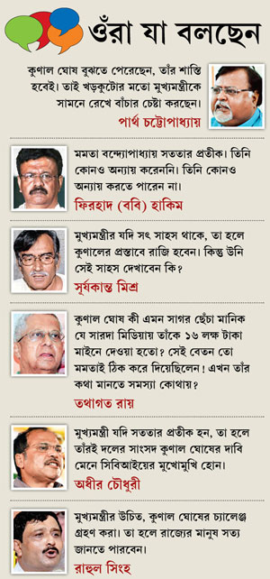 মুখ্যমন্ত্রী কী ভাবে এর মোকাবিলা করছেন? শুক্রবারই তিনি পাল্টা আঙুল তুলেছিলেন মিডিয়ার একাংশের দিকে। অভিযোগ করেছিলেন, সারদা কেলেঙ্কারি নিয়ে তাঁর দল ও সরকারের বিরুদ্ধে এক শ্রেণির সংবাদমাধ্যম মিথ্যা প্রচার করছে। এ দিন কুণালের বিস্ফোরক মন্তব্যের পরে তিনি আর মুখ খোলেননি। তবে তাঁর মন্ত্রীরা জবাব দিতে ময়দানে নেমে পড়েছেন। শনিবার তৃণমূল ভবনে বসে শিক্ষামন্ত্রী পার্থ চট্টোপাধ্যায় অভিযোগ করেন, “কুণাল ঘোষ দশ মাস জেলে। তিনি বুঝতে পেরেছেন তাঁর শাস্তি হবেই। তাই খড়কুটোর মতো মুখ্যমন্ত্রীকে সামনে রেখে বাঁচার চেষ্টা করছেন।” রাতে আবার এর পাল্টা জবাব দিয়েছেন কুণাল “আমার এত দুরবস্থা হয়নি!” মমতার হয়ে ব্যাট ধরে পুরমন্ত্রী ফিরহাদ হাকিম বলেছেন, “কুণাল ঘোষ একটা অপরাধী। একটা লোক জেল থেকে কী বলল, সে সম্পর্কে জিজ্ঞাসা করাটা অন্যায়।” এর পরে তিনি এ দিনও জোর গলায় বলেন, “তিনি (মমতা) সততার প্রতীক। তিনি কোনও অন্যায় করেননি। করতে পারেন না।” বসিরহাট দক্ষিণ কেন্দ্রে উপনির্বাচনের প্রচার সভা থেকে সৌগত রায় বলেন, “কুণালের কথার দাম সাংবাদিকদের কাছে থাকতে পারে, কিন্তু আমাদের কাছে নেই। আমরা ওকে অনেক দিন আগেই দল থেকে বহিষ্কার করেছি।”