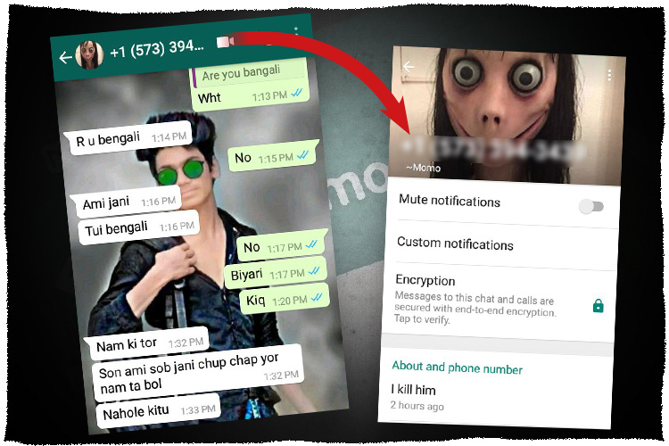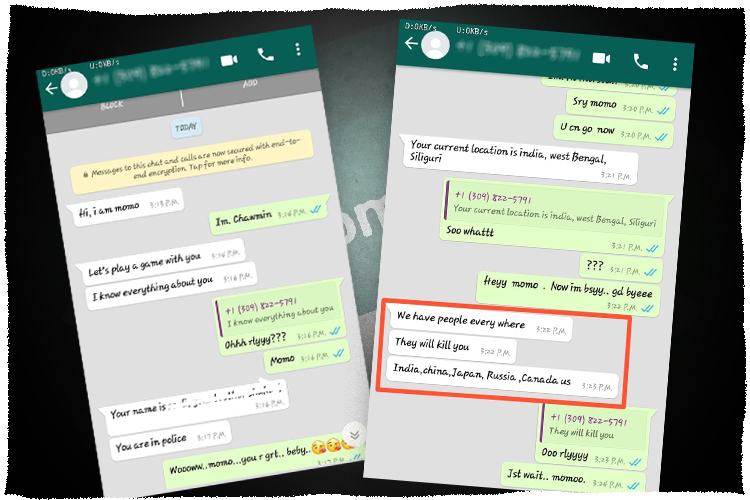 ঠিক একই ভাবে মোমোর কাছ থেকে খুনের হুমকি পেয়েছেন ধূপগুড়ির শালবাড়ির বাসিন্দা বাদশা আহমেদ। তার সঙ্গে আবার মোমো রীতিমতো বাংলায় চ্যাট করেছে। মোমোর কথা মতো না চলায় বাদশাকেও খুনের হুমকি দেওয়া হয়। বাদশা বলেন, ‘‘রাতেই আমি মোবাইল বন্ধ করে দিই। তার পরেই আমার বোন মুন আহমেদেকে মোমো হোয়াটস অ্যাপ করে। মুন ধূপগুড়ি সুকান্ত মহাবিদ্যালয়ের দ্বিতীয় বর্ষের ছাত্রী। মুন কোনও উত্তর না দেওয়ায় ওই নম্বর থেকে ভিডিয়ো কল করা হয়। বোন তখন ভয় পেয়ে ওই নম্বরটি ব্লক করে দেয়।”