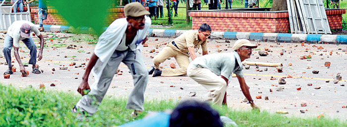 রাস্তা থেকে ইট কুড়িয়ে চলছে পাল্টা মার। তার মধ্যেই পালাতে গিয়ে উল্টে পড়ল পুলিশ। ছবি: বিশ্বনাথ বণিক।